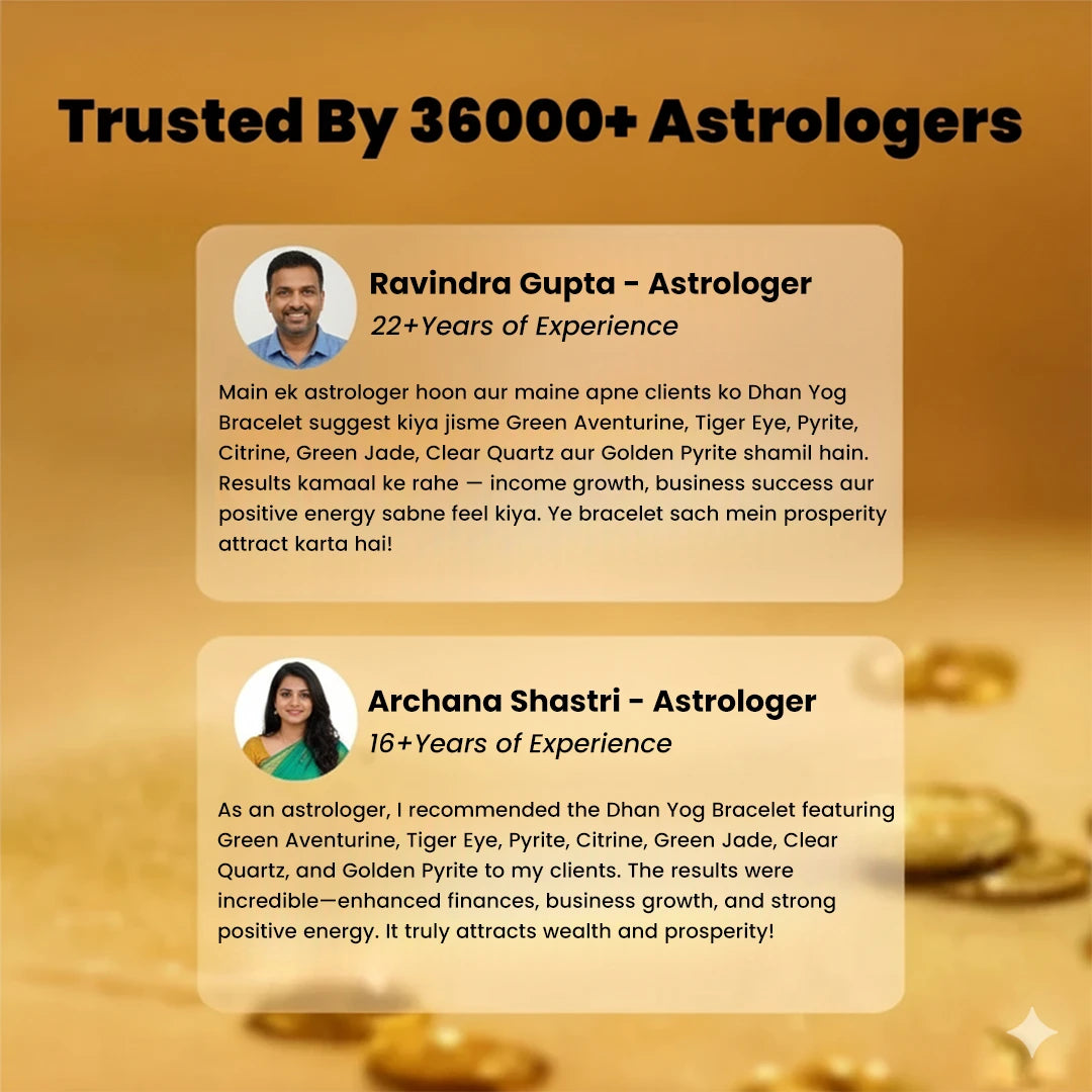 The Dhan Yog Bracelet is traditionally most effective when first worn on a Thursday (Brihaspati Var in Hindu tradition), which is the day associated with prosperity, wealth, and Jupiter—the planet of abundance and good fortune. Thursday is considered the most auspicious day for initiating any wealth-attracting practices.